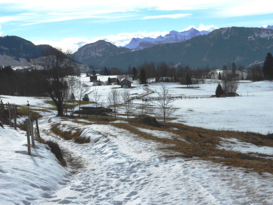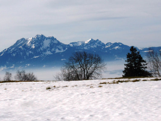 Als wir auf dem Zugerberg ankommen, pfeift uns ein kräftiger Föhn um die Ohren und fegt die Schneeresten weg. Wegen des Föhns haben wir tolle Fernsicht.